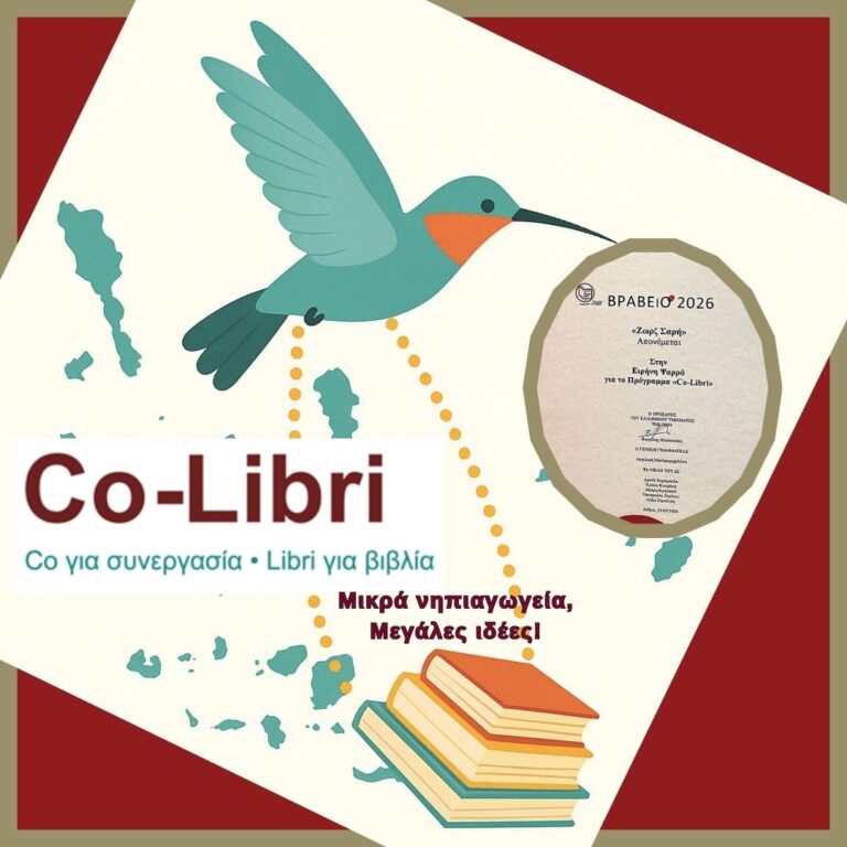 Το «Co-Libri» είναι μια καινοτόμος πρωτοβουλία φιλαναγνωσίας και συνεργασίας, σχεδιασμένη για μικρά και απομακρυσμένα Νηπιαγωγεία (αρχικά των Κυκλάδων). Στόχος του είναι να μετατρέψει τη γεωγραφική απομόνωση σε ευκαιρία επικοινωνίας, συμμετοχής και κοινής δημιουργίας, δίνοντας στα παιδιά τη δυνατότητα να συναντηθούν, να αλληλεπιδράσουν και να μοιραστούν κοινές αναγνωστικές εμπειρίες με αφετηρία το βιβλίο.