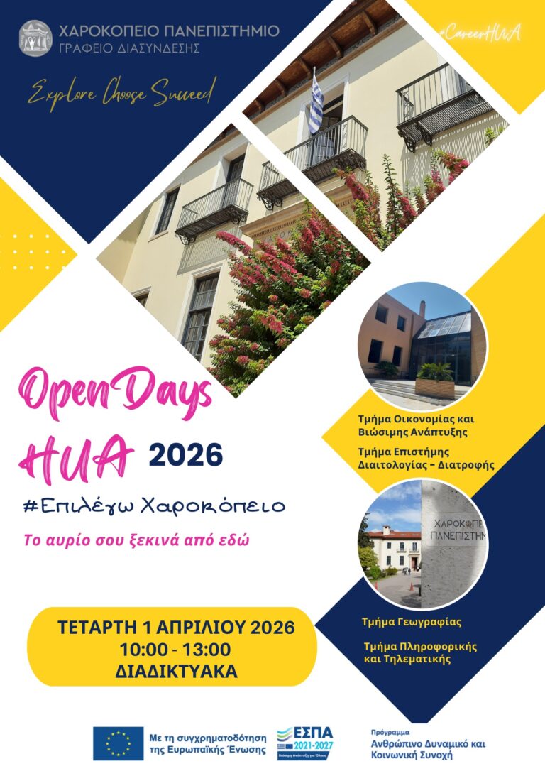 Το Χαροκόπειο Πανεπιστήμιο προσκαλεί μαθητές, μαθήτριες και εκπαιδευτικούς σε διαδικτυακή ενημερωτική εκδήλωση για τις σπουδές και τις δυνατότητες που προσφέρει το Πανεπιστήμιο.