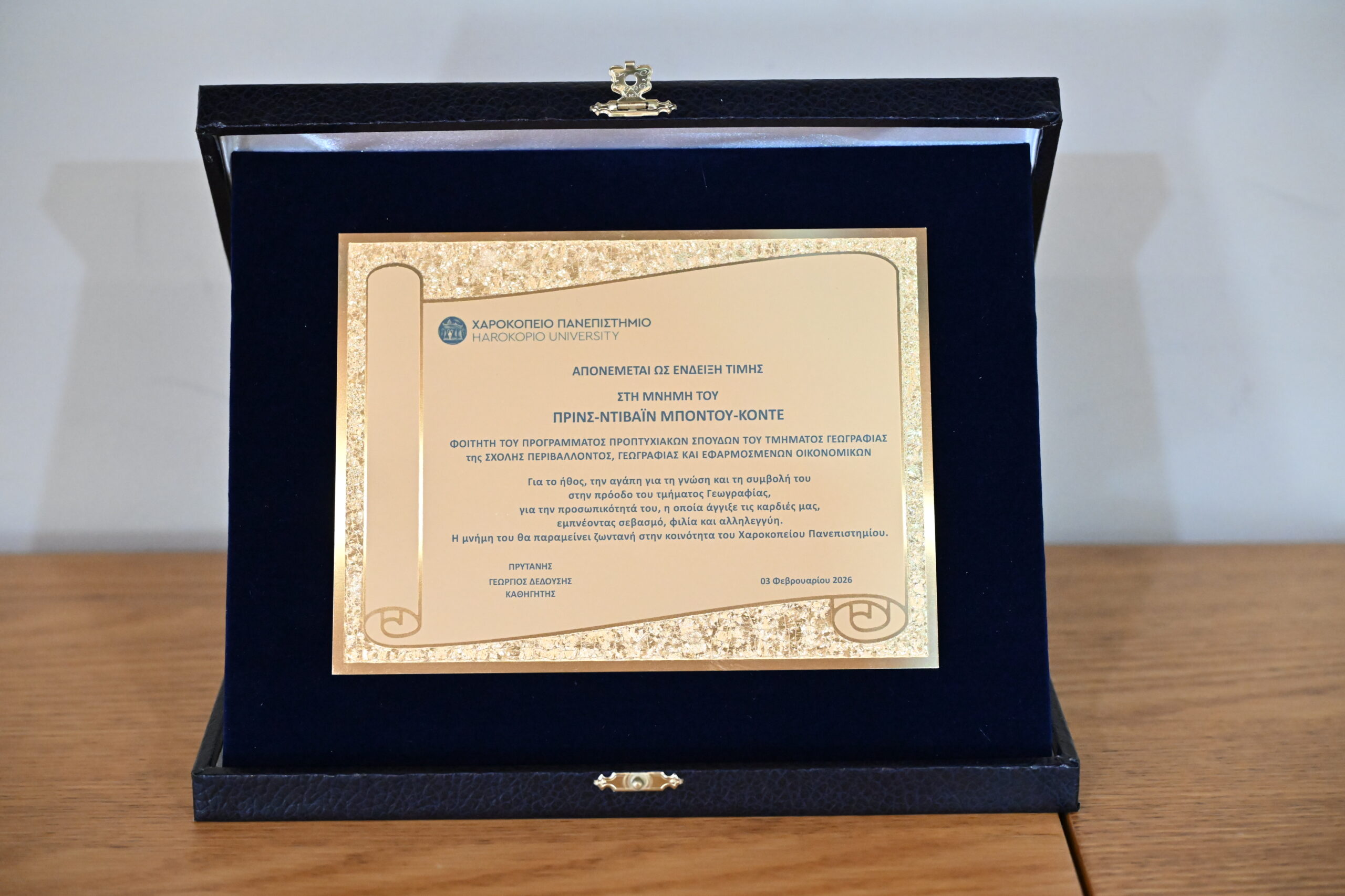 Ιδιαίτερα συγκινητική ήταν η απονομή τιμητικής πλακέτας από τον Πρύτανη του Χαροκοπείου Πανεπιστημίου, Καθηγητή Γεώργιο Δεδούση, στη μητέρα του εκλιπόντα ΠΡΙΝΣ-ΝΤΙΒΑΪΝ ΜΠΟΝΤΟΥ-ΚΟΝΤΕ, φοιτητή του Προγράμματος Προπτυχιακών Σπουδών του Τμήματος Γεωγραφίας της Σχολής Περιβάλλοντος, Γεωγραφίας και Εφαρμοσμένων Οικονομικών. Μια λιτή αλλά ουσιαστική πράξη μνήμης και τιμής, που ανέδειξε τον ανθρώπινο χαρακτήρα της ακαδημαϊκής κοινότητας.