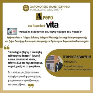 Άρθρο στο περιοδικό “VITA” από τον κ. Γεώργιο Δεδούση, Καθηγητή Μοριακής Γενετικής και Διατροφογενετικής στο Τμήμα Επιστήμης Διαιτολογίας – Διατροφής και Πρύτανη του Χαροκοπείου Πανεπιστημίου